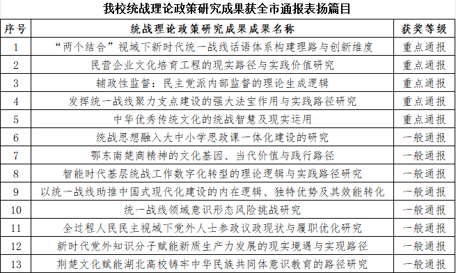 我校党委统战部报送的统战工作实践创新成果《落实工作机制 发挥优势作用 以党外知识分子统战工作助力支点建设》荣获2025年全市统战工作实践创新成果(全市4项),5篇统战理论政策研究成果获重点通报(全市8篇)、8篇获一般通报(全市17篇)。